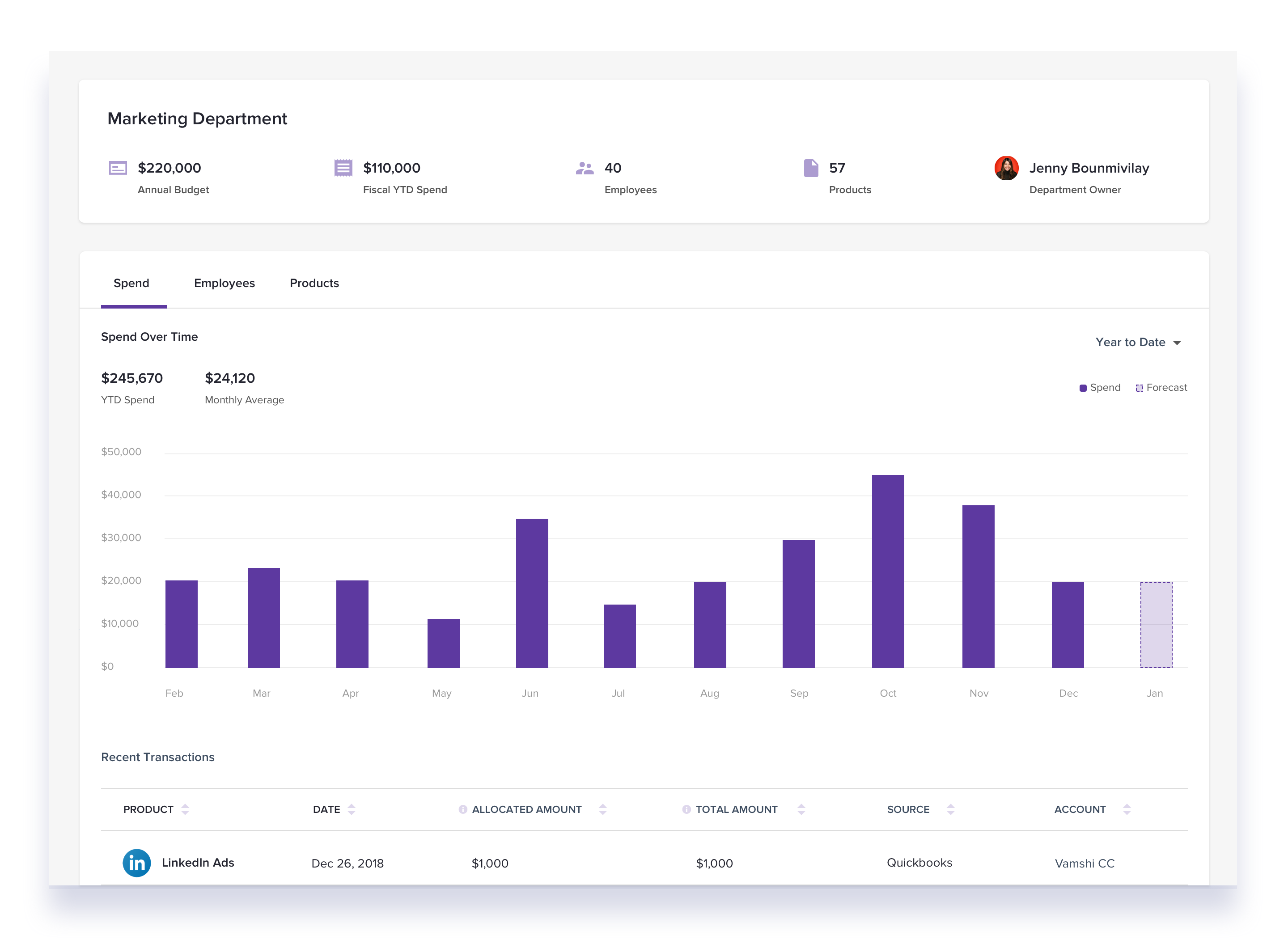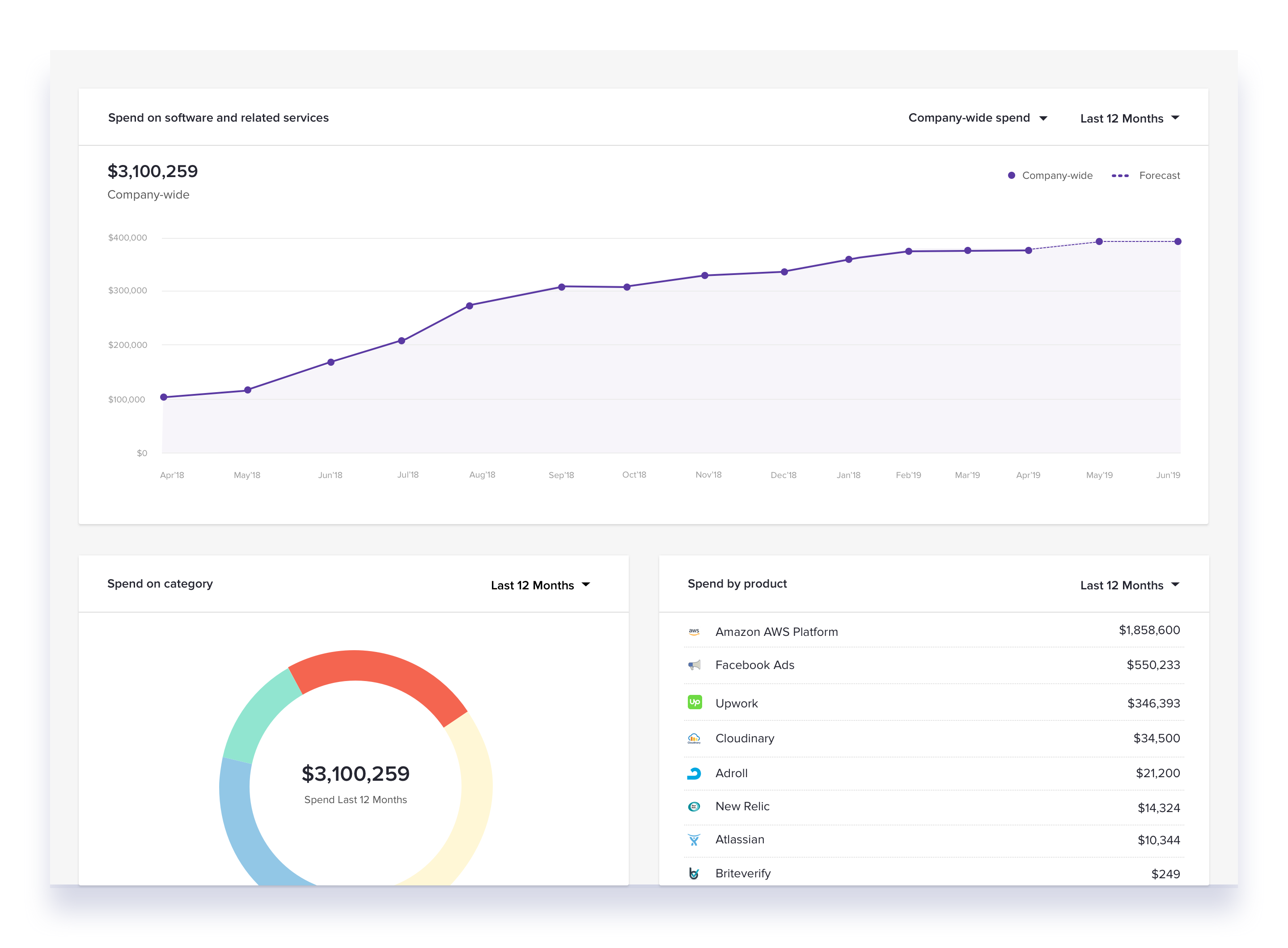 Set up in 5 minutes to instantly view a breakdown and forecast of your software spend over time.