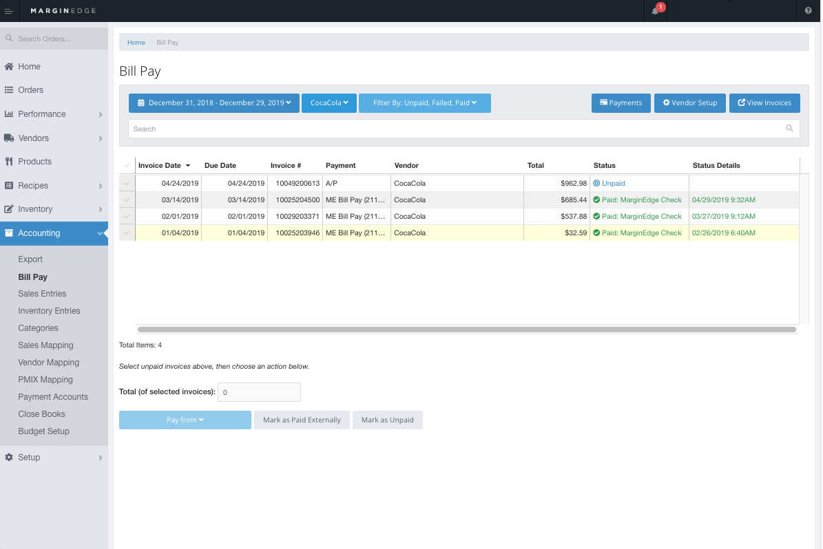 Don’t pay fees to pay bills any more. Line-item details of your invoices are processed in as little as 24 hours. View all unpaid invoices on a single screen and sort them by due date, vendor and payment status. Already using BILL? We can support your transition to MarginEdge.