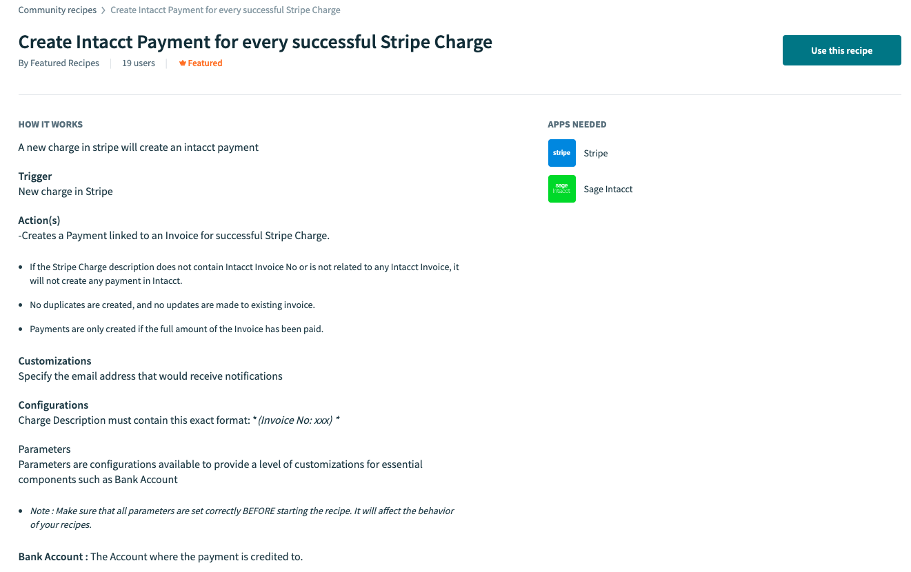 Instantly integrate Sage Intacct with other apps and automate your workflows across them. Easily connect to applications such as Salesforce, Slack, Dropbox, Shopify, Stripe, Jira and many other applications.