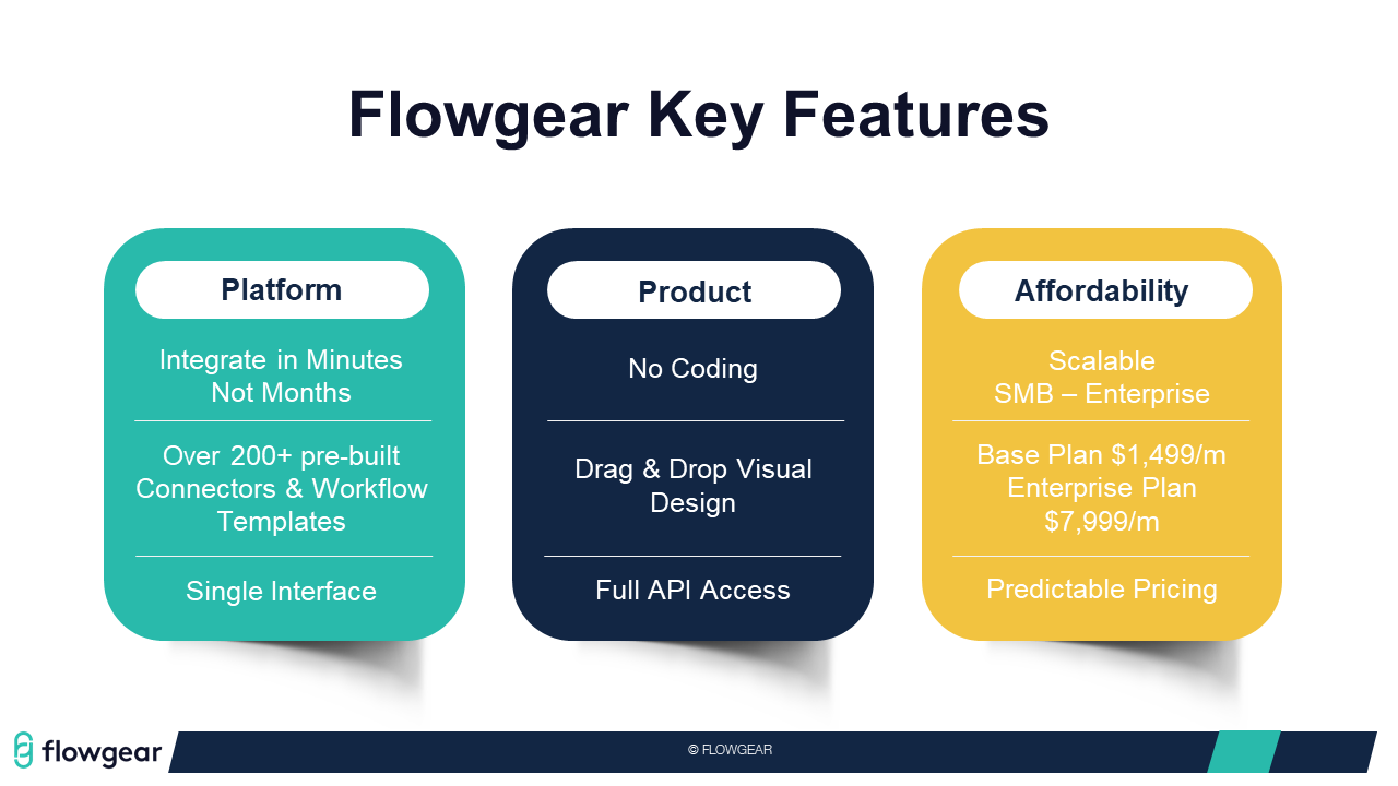Platform - Product - AffordabilityFlowgear offers an enterprise-grade solution with an affordable and scalable subscription model. This enables both medium and large corporations to rapidly implement powerful integration solutions without the need for substantial upfront planning or capital-intensive infrastructure.