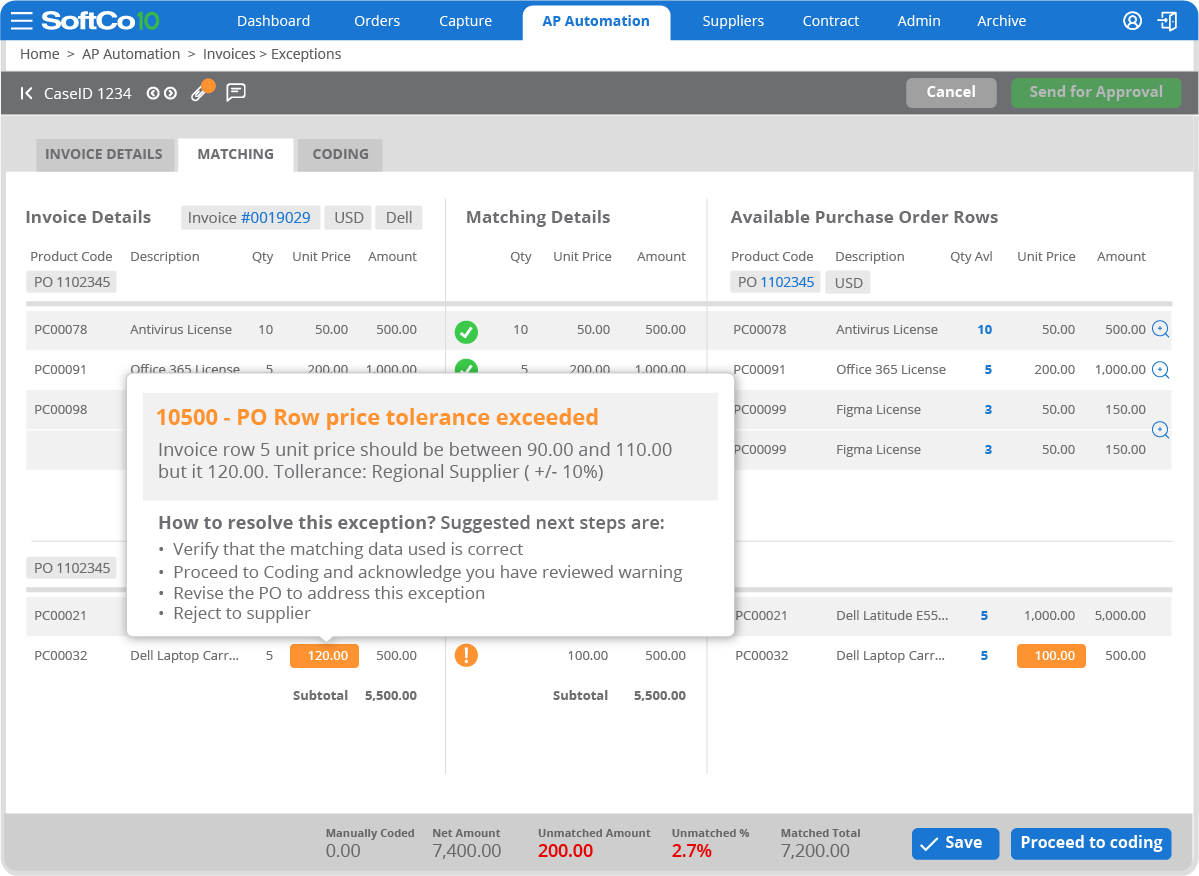 SoftCoAP processes all invoice types from AI Capture through to AI Match, approval, exception handling and payment, achieving over 90% straight-through processing. AI Capture extracts invoice data across formats with high accuracy, minimizing manual entry and errors. AI Match handles complex scenarios such as incomplete data, FX conversions and rounding differences, delivering a 38% improvement in match rates compared to standard tools. AI Coding analyzes learned invoice patterns to automatically assign accurate general ledger codes, while AI Routing dynamically progresses invoices to the correct approvers based on confidence thresholds and controls, reducing routing time by up to 89%. Recurring invoices such as rent, utilities and subscriptions are validated against underlying POs and routed automatically without requiring GRNs or additional documentation.