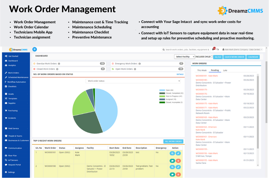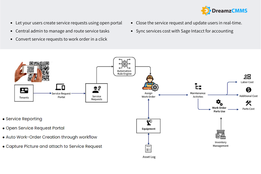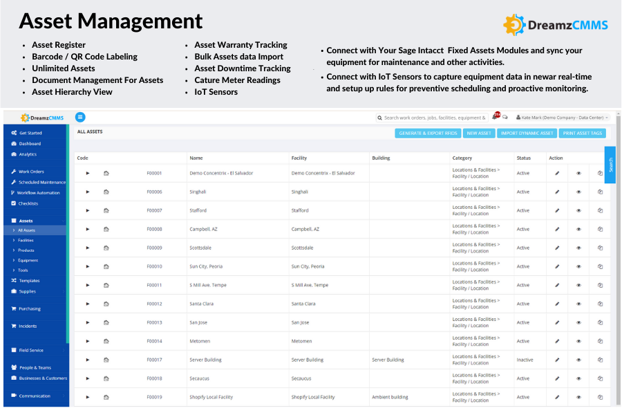 Enhanced asset management: Using DreamzCMMS Platform in Integration with Sage Intacct allows you to track the life cycle of your assets, from acquisition to disposal. This provides you with real-time visibility into your assets and helps you make data-driven decisions to extend their lifespan and maximize your ROI.