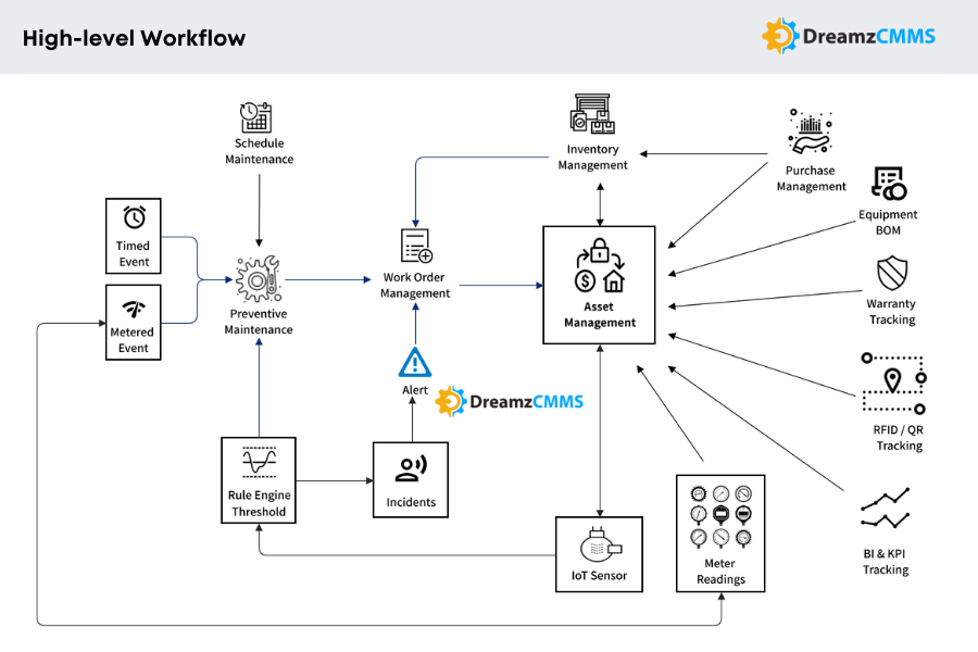 DreamzTech is an award-winning 12+ years leading custom software development company with expertise in New Age Technologies such as IoT, Blockchain, Enterprise Mobility, Progressive Web App Platform, Cloud Apps & Security, Data Analytics, Augmented Reality & Custom Web design & development. DreamzCMMS, a cloud-based Smart Asset Management and Maintenance Management Platform that enables businesses to manage their equipment and practice preventive and scheduled maintenance management processes with Calendar scheduling, Work Order Auto Scheduler and using IoT Sensors. DreamzCMMS is an advanced and innovative solution that leverages the latest technologies such as Internet of Things (IoT), and Predictive Analytics to optimize maintenance operations and increase efficiency. DreamzCMMS is designed to be highly adaptable and customizable to meet the unique needs of different businesses. It can automate and streamline maintenance processes, such as work order management, preventive maintenance scheduling, inventory management, and asset management, among others. It can also provide real-time data and insights that enable data-driven decision-making, improve maintenance planning, reduce downtime, and increase productivity. Additionally, DreamzCMMS software IoT Sensor based proactive monitoring to anticipate equipment failure and prevent unplanned downtime. This enables maintenance teams to take preventive measures before equipment failure occurs, reducing the risk of costly repairs and downtime. Overall, a Smart CMMS software is a powerful tool that can help businesses optimize their maintenance operations and improve overall equipment efficiency. |