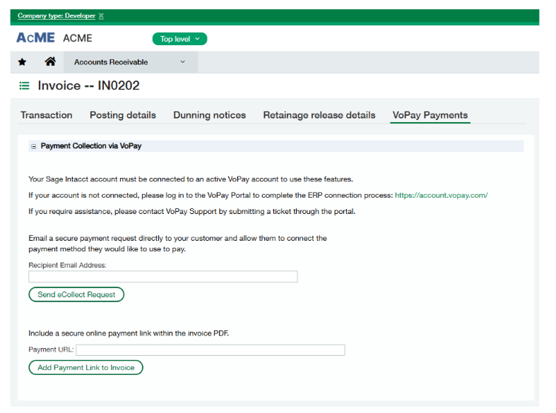 Collect customer payments directly from invoices while automatically updating AR records and payment status within Sage Intacct.