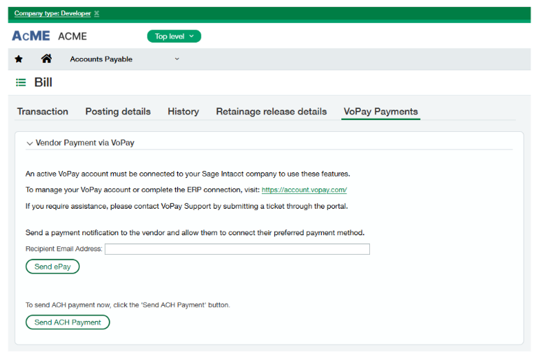 VoPay enables Sage Intacct users to manage the full payment lifecycle directly within their ERP environment. Finance teams can initiate, approve, process, and reconcile payments without switching systems or manually transferring data between banks and accounting records.