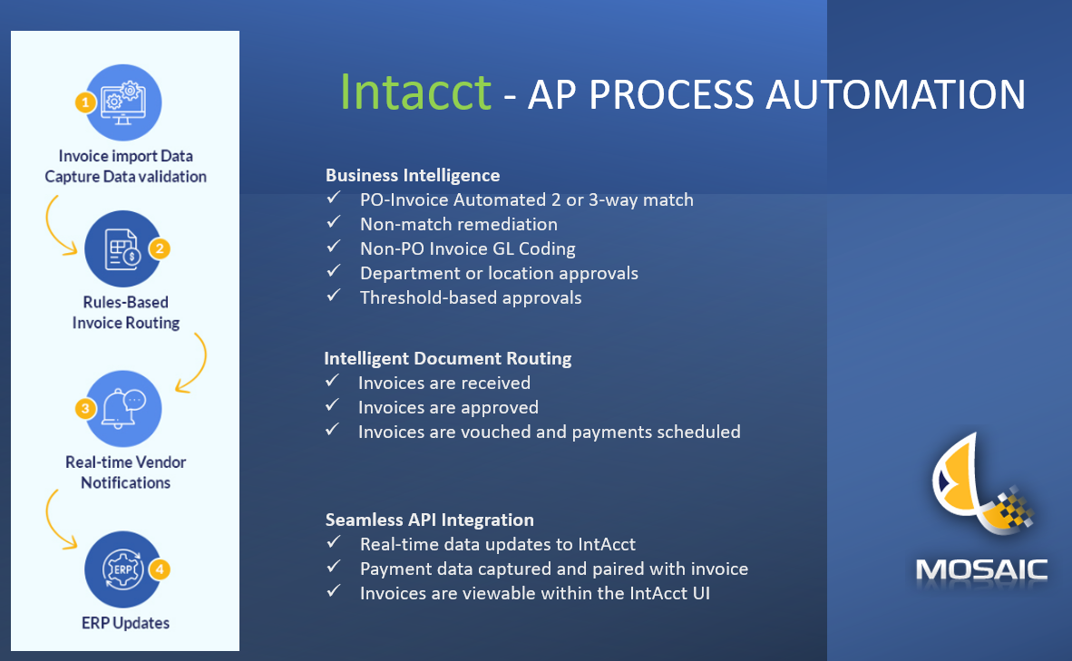 DocStar AP Automation’s powerful workflow engine is supported with an easy to use graphical workflow designer, so your team can learn and create workflows too—no advanced technical skills required. Visit Mosaic to enjoy the benefits of a real-time API-based integration with Sage Intacct!