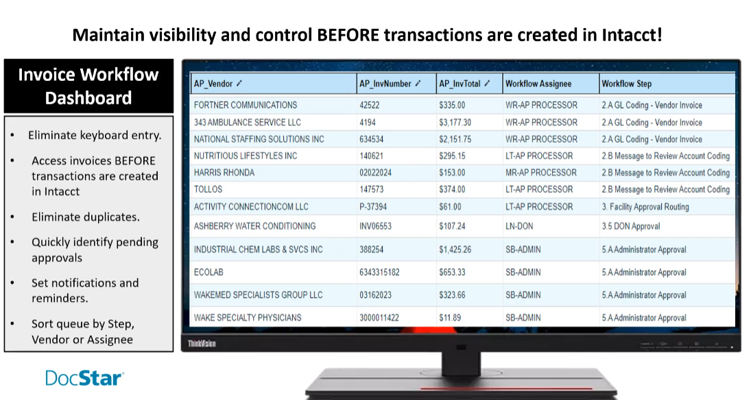 With Intelligent Data Capture and flexible workflows, DocStar AP Automation for Sage Intacct makes AP processing easy and smart—no more stacks of invoices on your desk, no more missing files, no more chasing the right person down to approve payments. With 24/7 access from anywhere in the world, your AP process will be efficient and cost effective.<br><br><br>