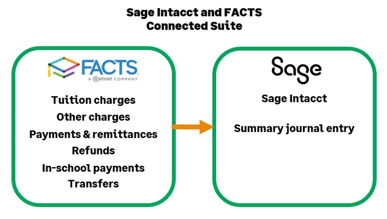 Sage Intacct, the leader in nonprofit cloud accounting solutions, and FACTS, the leader in school management solutions, have partnered to give you the choice and flexibility you’ve been waiting for in your school’s technology stack. The Sage Intacct and FACTS Connected Suite provides K-12 private, faith-based, and charter schools the best choice for accounting, school tuition management, and payment processing.