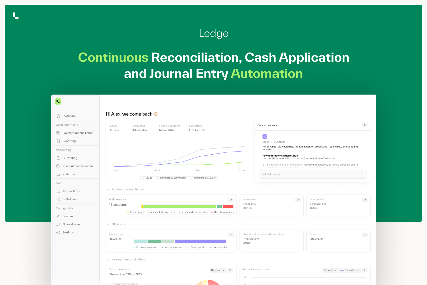 - Proactively identify and resolve exceptions and discrepancies - teams using Ledge report a 50% faster time to resolution.