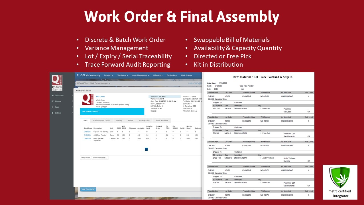 - Traceability & Compliance: Track lots, serials, expiries and more all as part of our workflows. Direct Integration with METRC for Distribution based Seed to Sale compliance for Cannabis based businesses. UDI barcode printing and parsing for Medical Device based businesses.