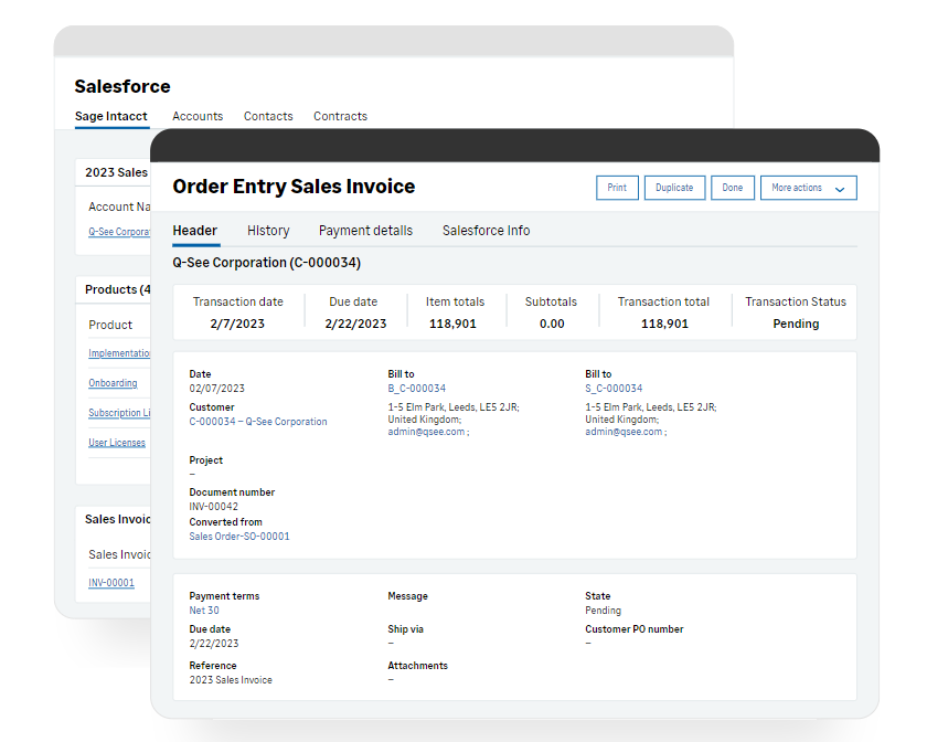 Streamline communication and collaboration Sales works in Salesforce—pricing, billing and payments are easily visible. Accounting works in Sage Intacct. Everyone stays up to date—without time-consuming rekeying of information, phone calls or emails, or jumping between systems.