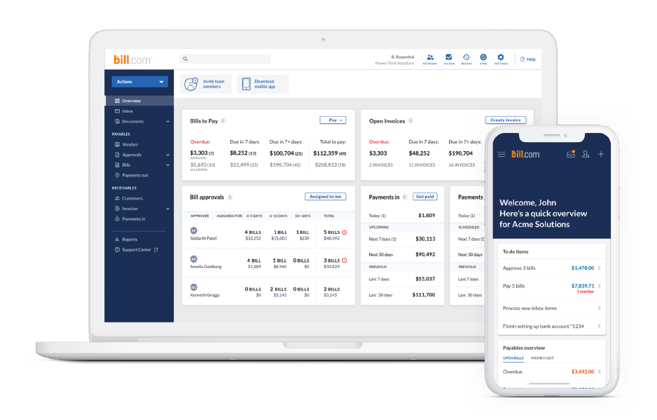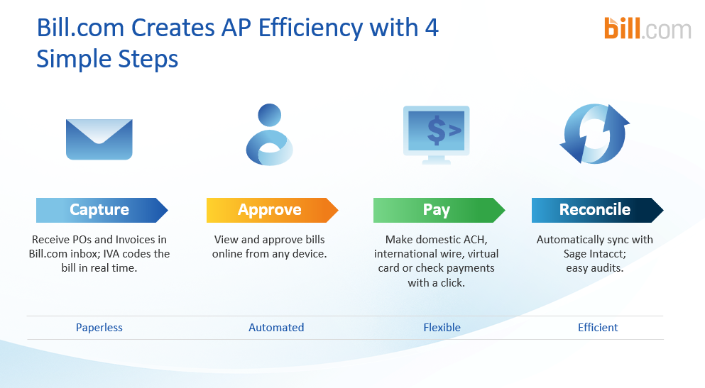 Increase efficiency and save timeSave 50% of time on AP by eliminating the manual work associated with processing paper invoices and checks, getting approvals, and recording payments in your accounting system. Bill.com streamlines your PO-to-payment workflow to increase efficiency and give you more control, all from one place.
